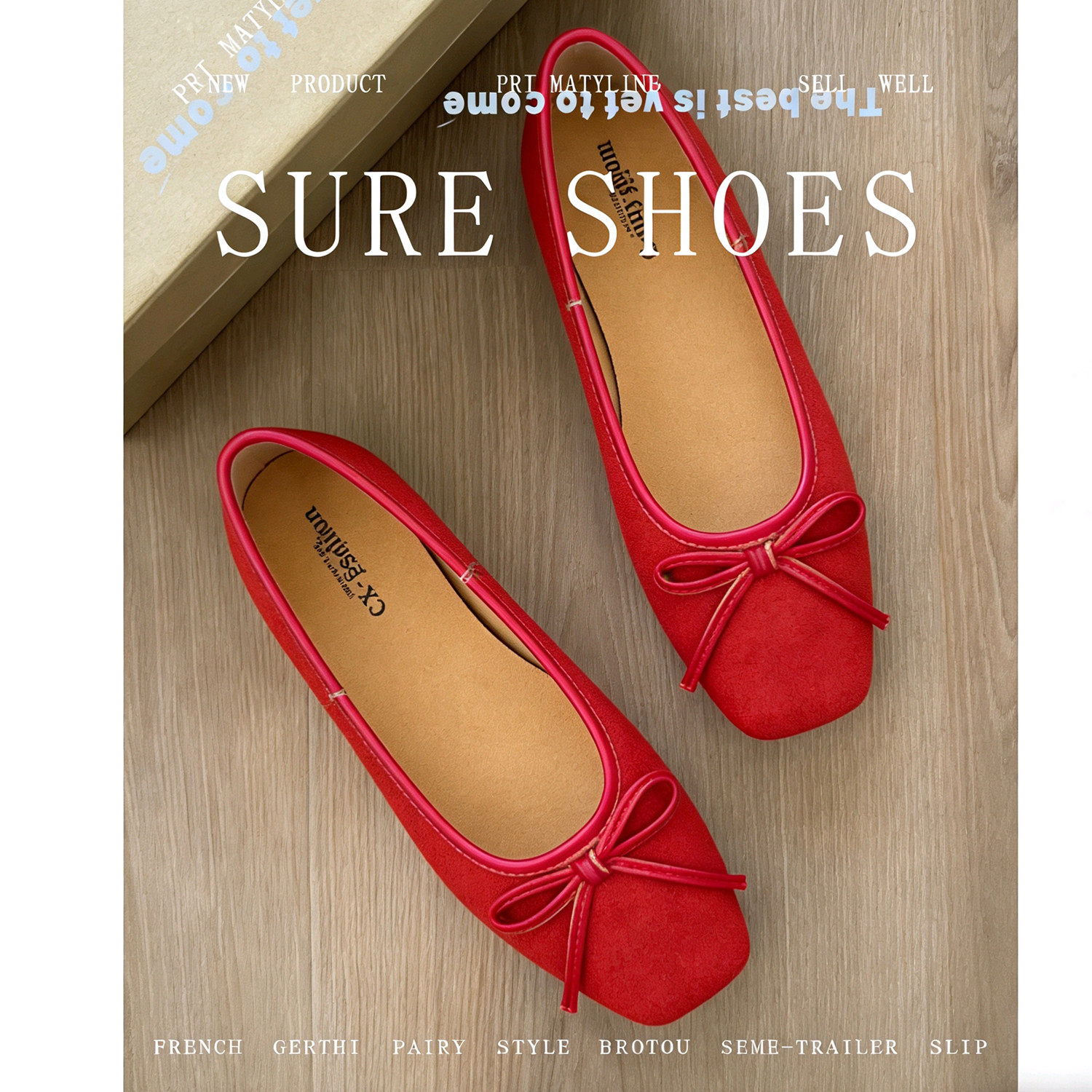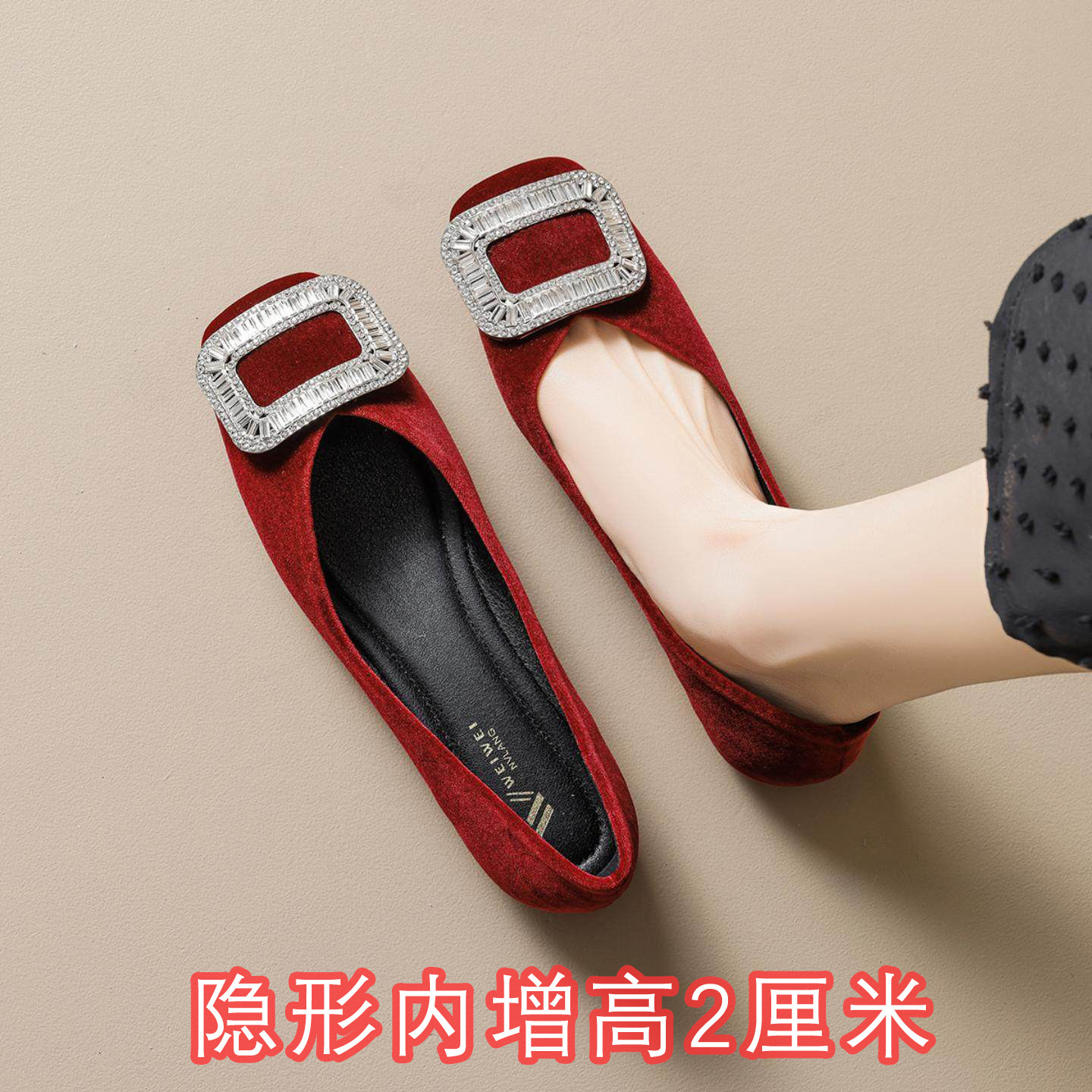 2026春季新款网红温柔风水钻扣平跟单鞋女红色浅口方头平底仙女鞋
