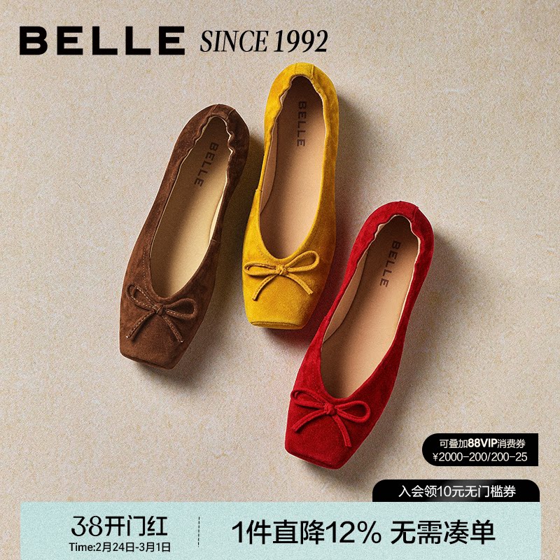 百丽女鞋绒面平跟单鞋女2026春新款柔软真皮轻便红色鞋子H8003AQ6