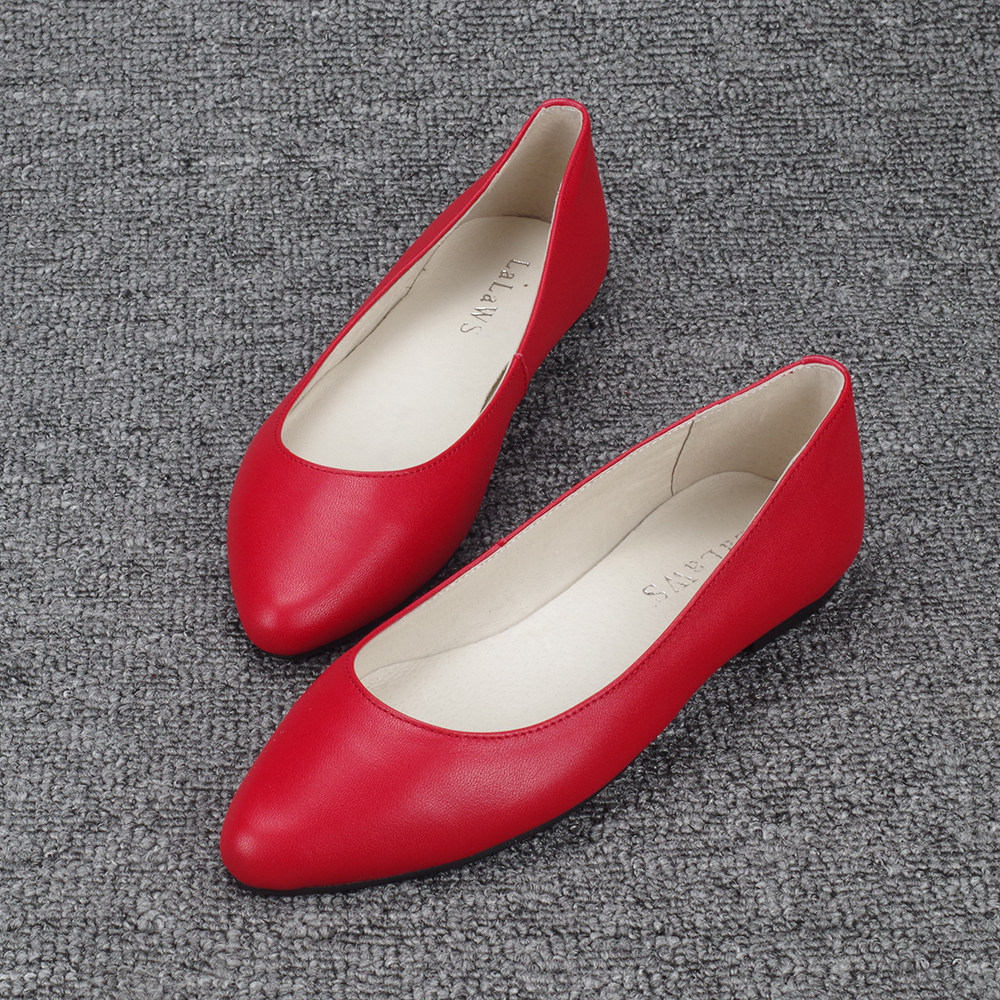 新款百搭尖头平底单鞋软底舒适浅口平跟真皮女鞋大码船鞋红色婚鞋