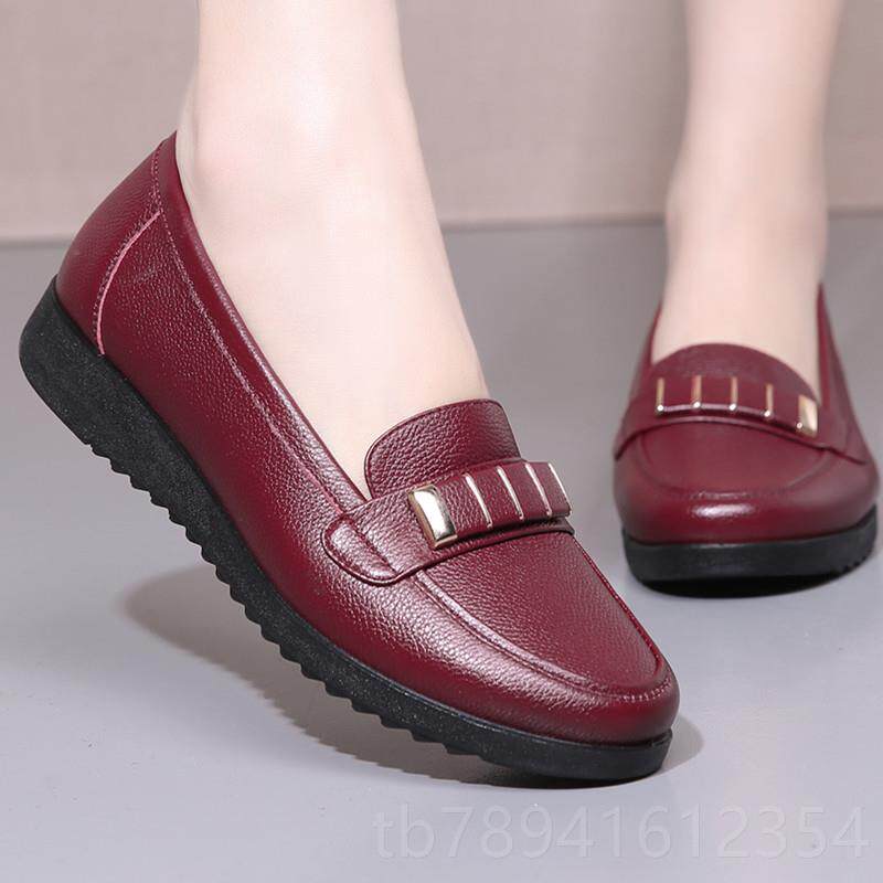 妈妈鞋单鞋平跟防滑软底真皮2025年春款中老年红色女士一字扣皮鞋