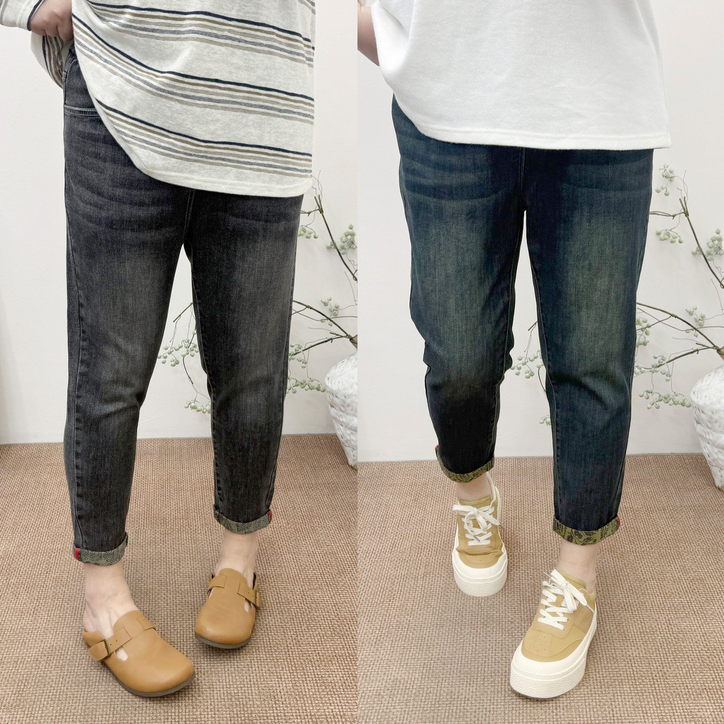 春秋浅蓝色加长牛仔裤女小直筒修身超长深蓝豹纹翻边女卷边修腿型