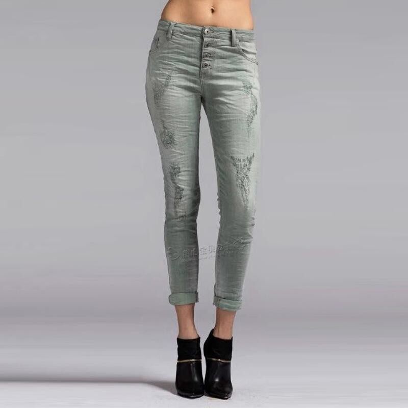 清仓现货 Maryley中腰水洗绿色破洞褶皱卷边紧身九分小脚牛仔裤女
