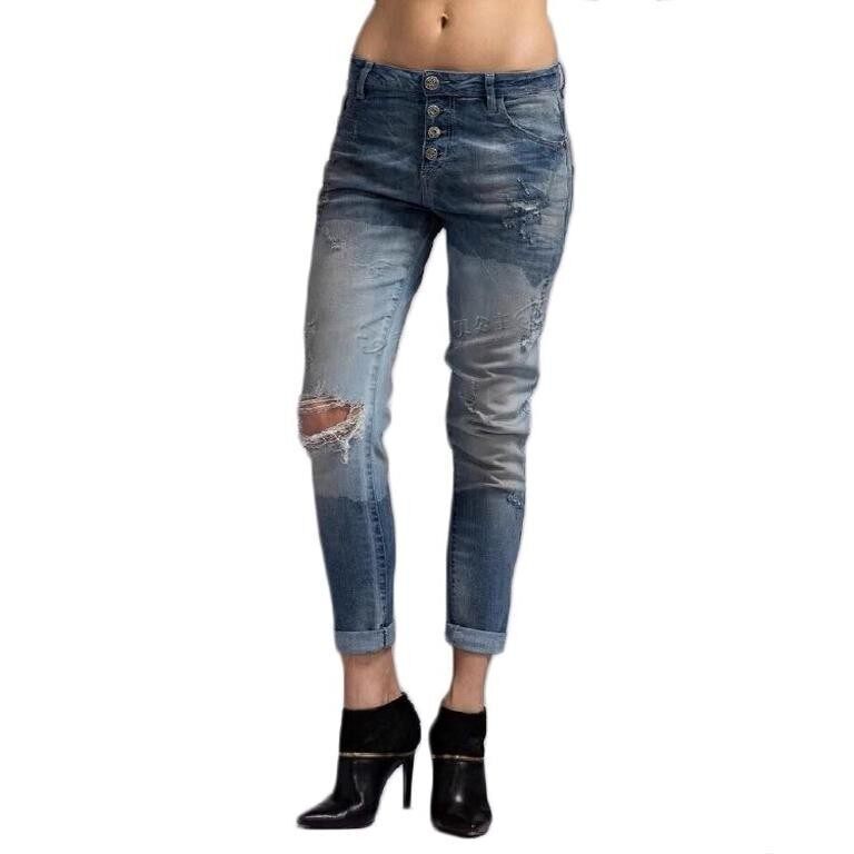外贸女装百搭磨白两粒扣高腰卷边小脚哈伦牛仔裤显瘦韩版气质裤子