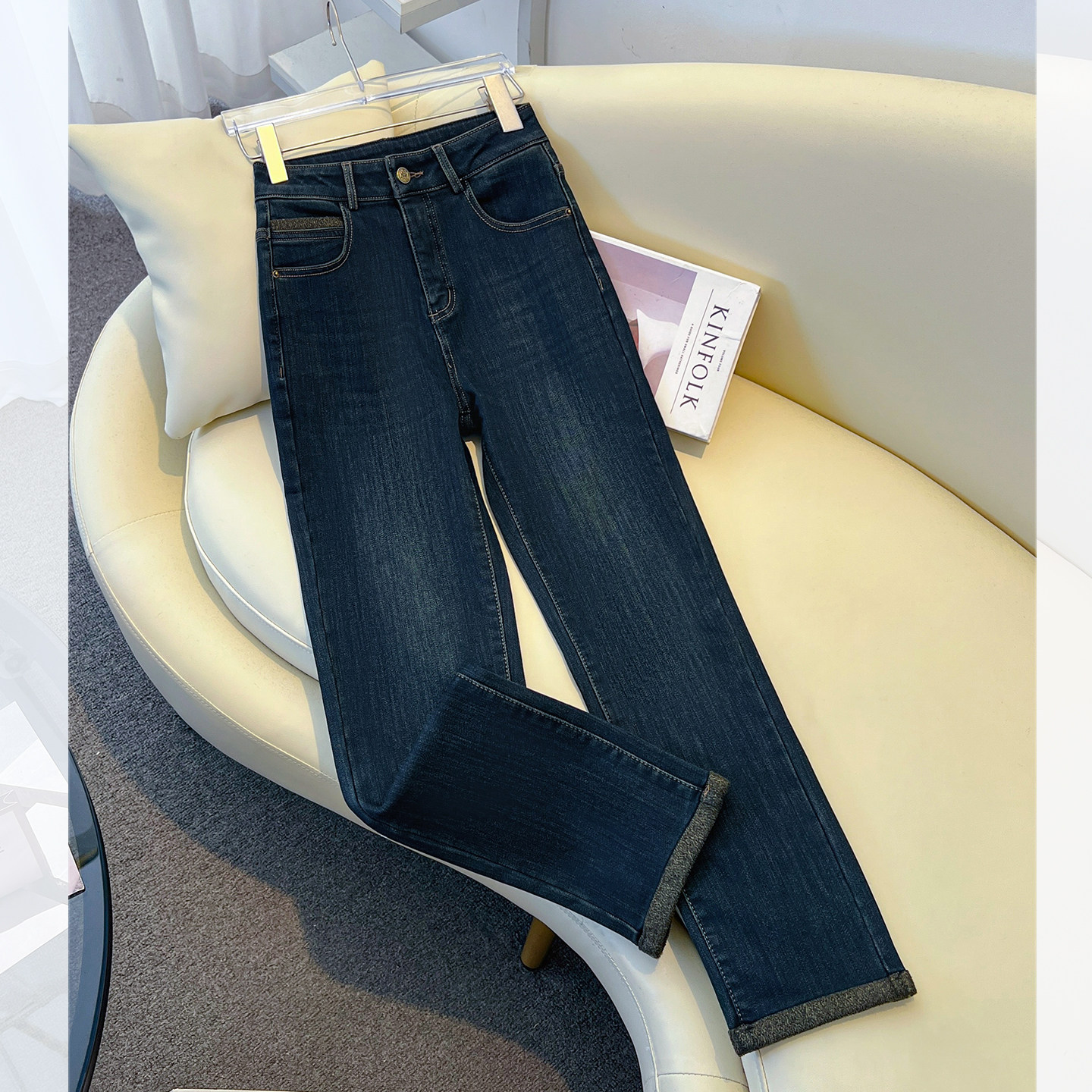 复古蓝色高腰翻卷边小脚牛仔裤女加绒加厚2025秋冬新款修身铅笔裤