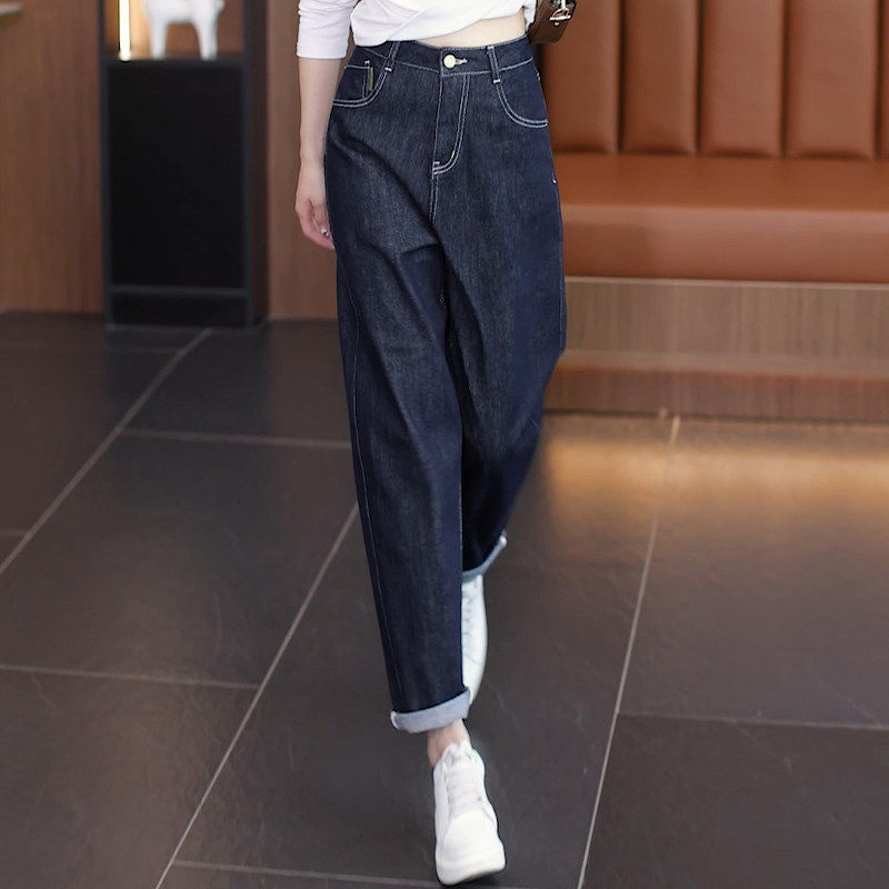 深蓝卷边牛仔裤女2026新款春秋女裤小脚老爹裤宽松高腰烟管哈伦裤