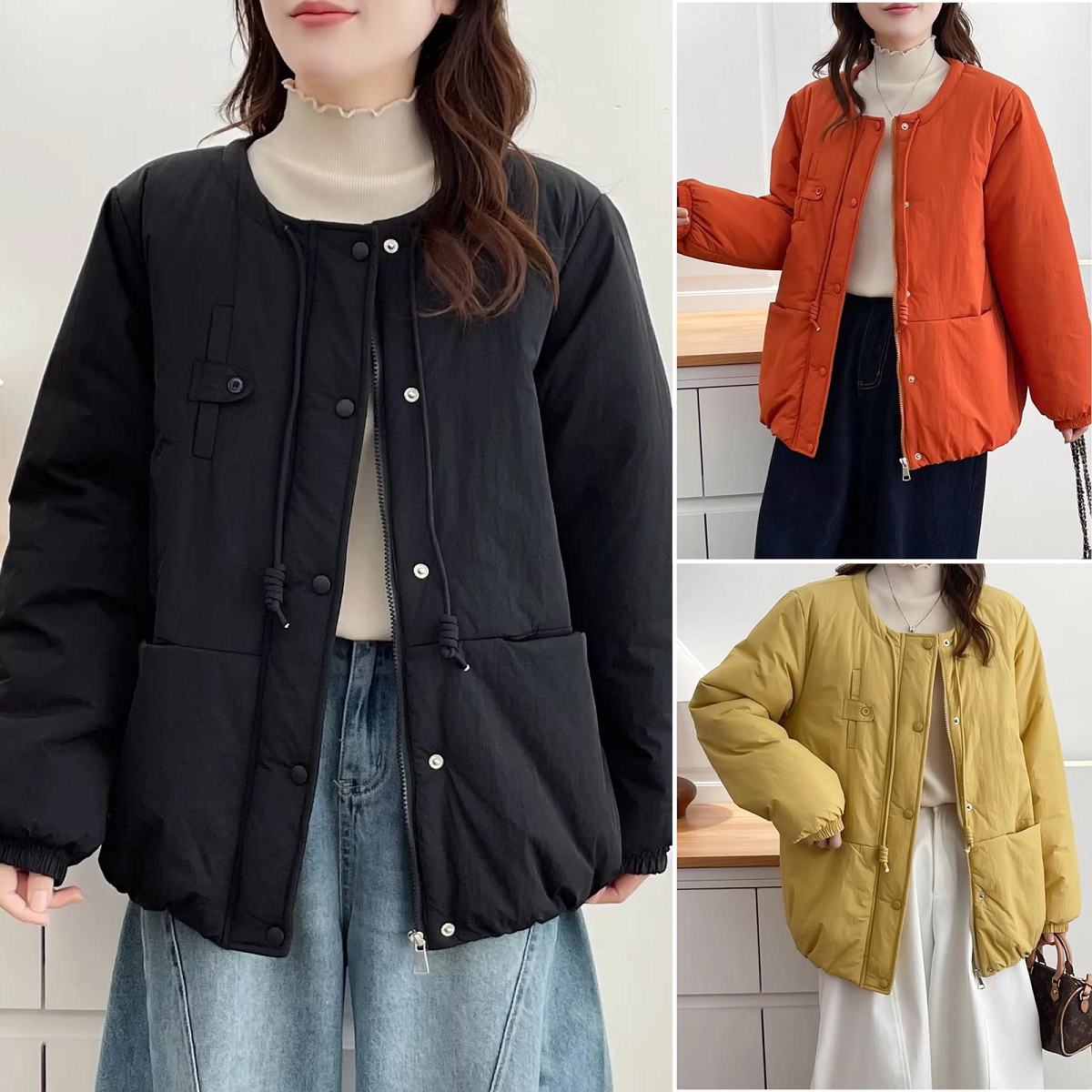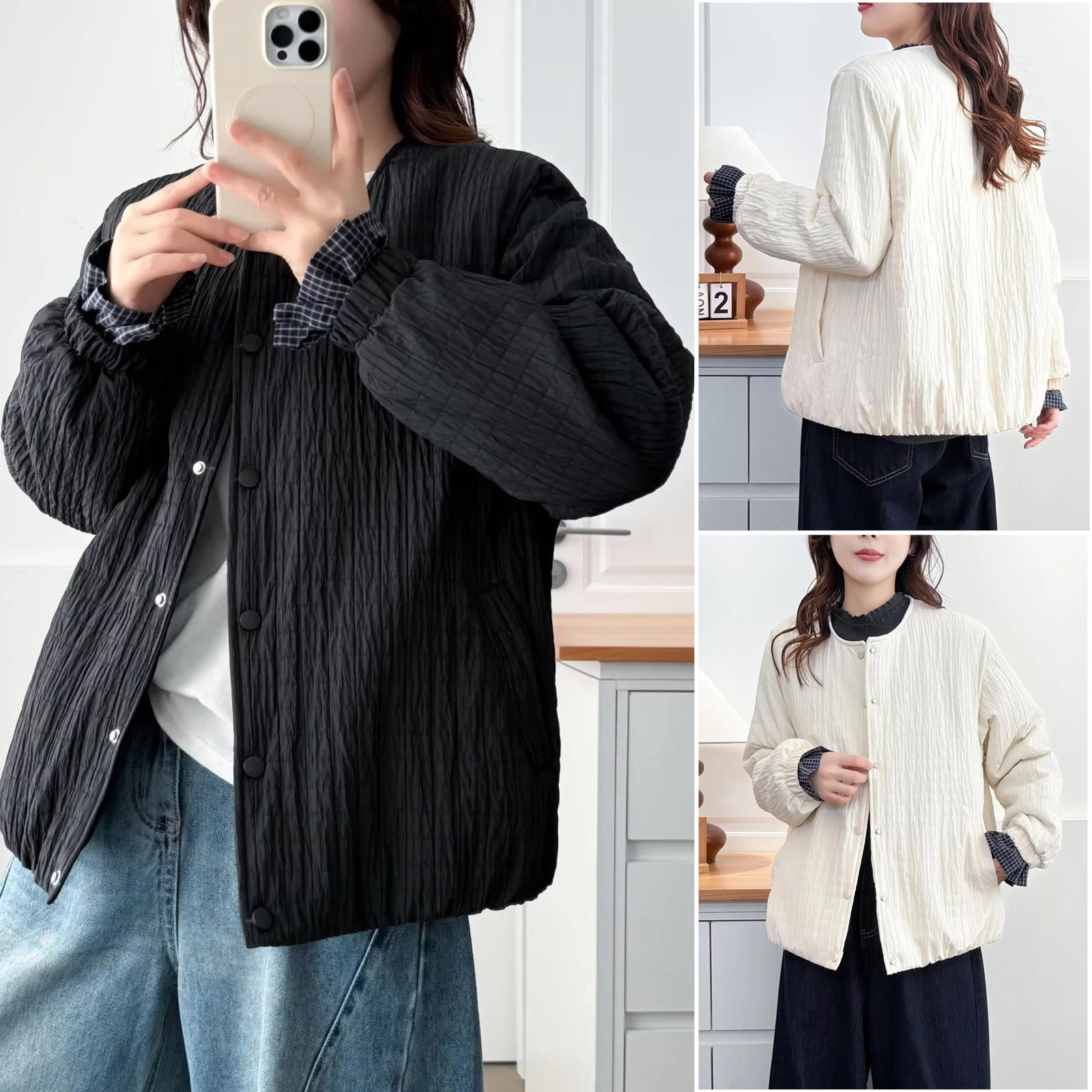 2026冬装新款大码女装胖妹妹圆领中年棉衣轻薄款褶皱双口袋女棉服
