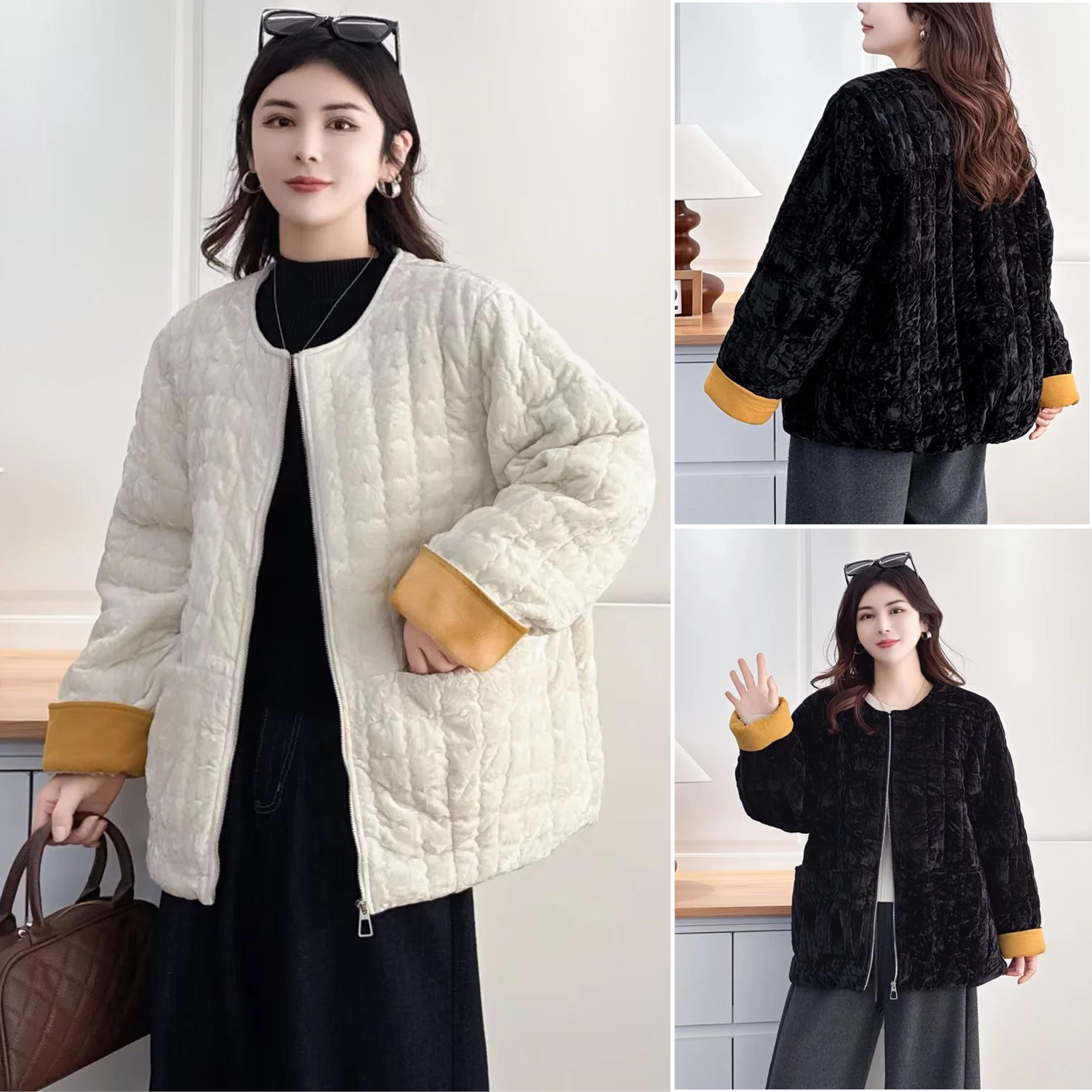 2026胖妹妹冬装大码女装新款韩系加绒丝绒棉服拼色圆领中年女棉衣
