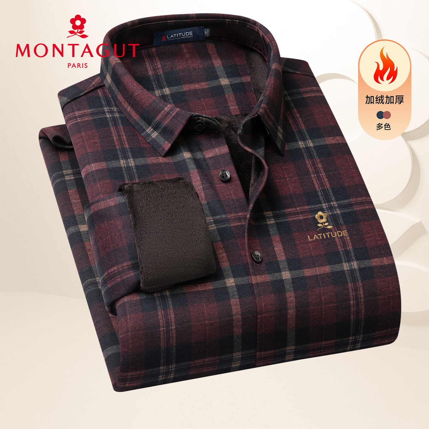 100%纯棉-梦特娇男装格纹长袖衬衫加绒加厚冬季中年男士保暖衬衣Z