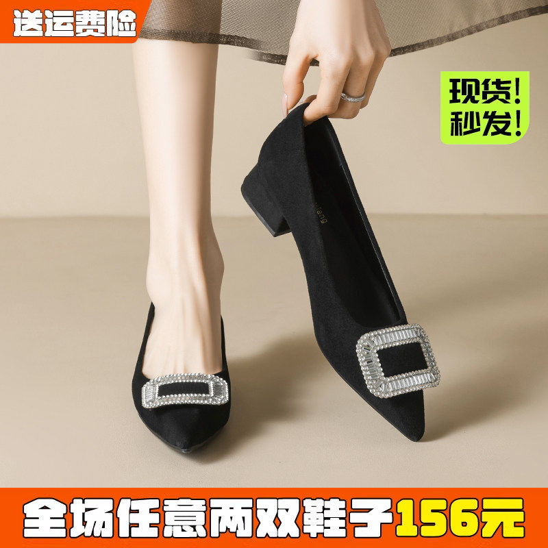 方扣水钻粗跟尖头单鞋女春季百搭中跟晚风浅口瓢鞋大码女鞋41到43