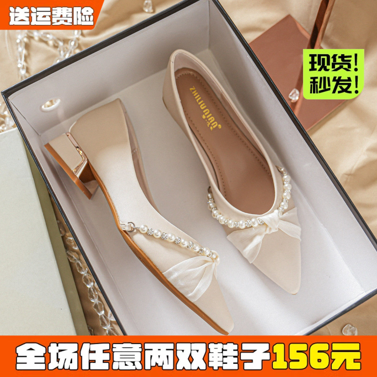 法式晚风单鞋女粗跟尖头伴娘鞋舒适不累脚高跟鞋女中跟结婚仙女新