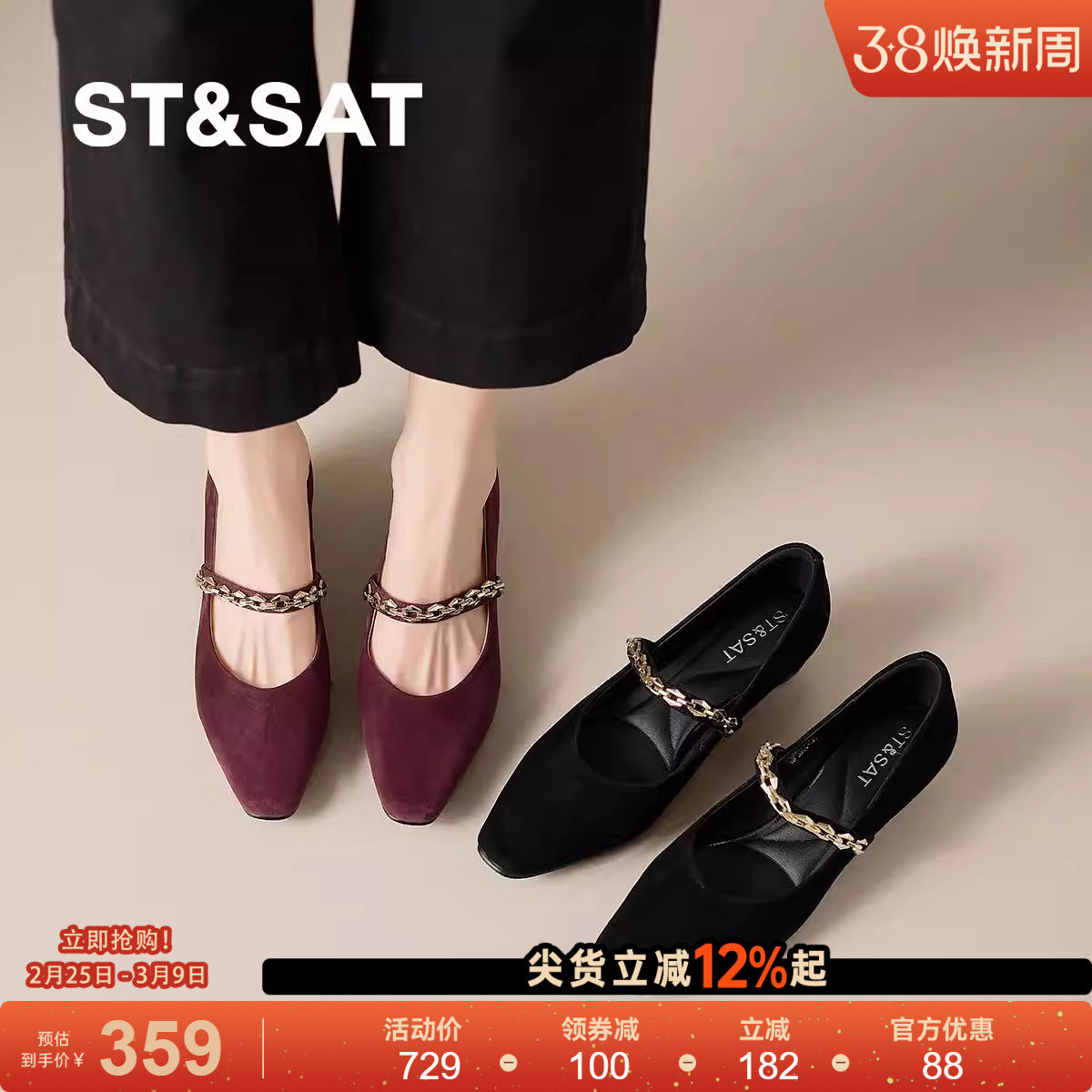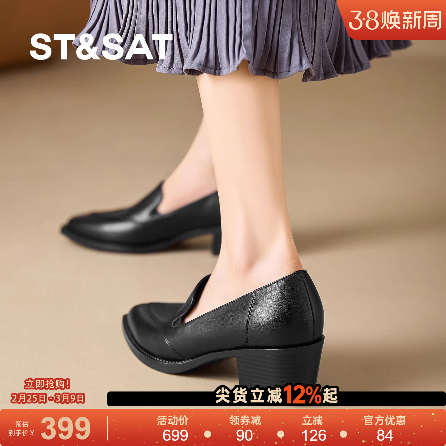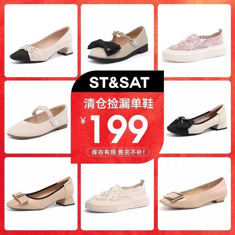 St&Sat/星期六深口单鞋女25春秋新款粗跟女士皮鞋尖头中跟乐福鞋