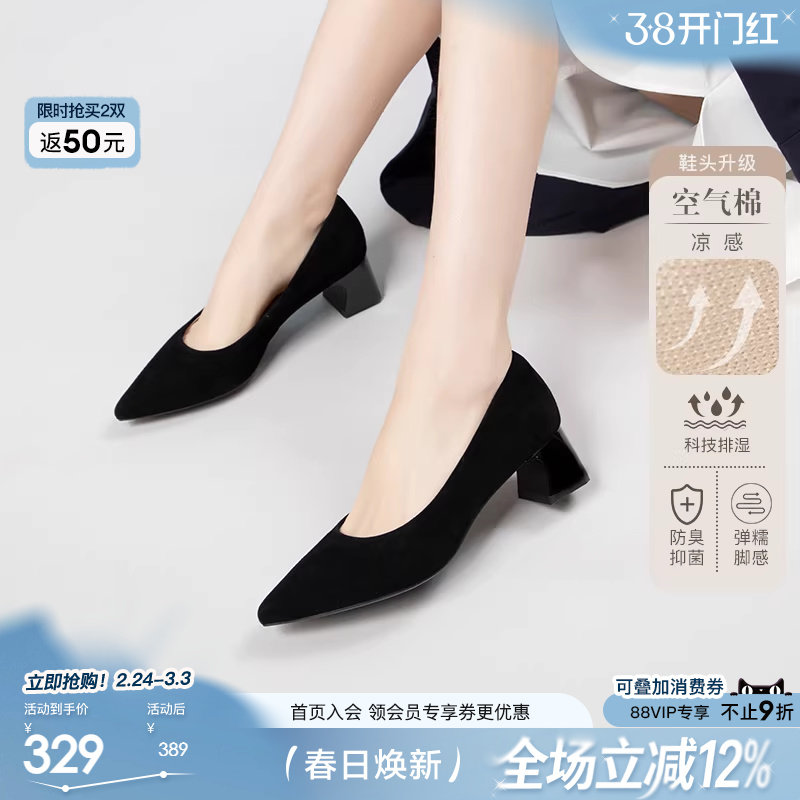康奈25秋季新款真皮尖头浅口单鞋女粗跟中跟职业通勤鞋公务员女鞋