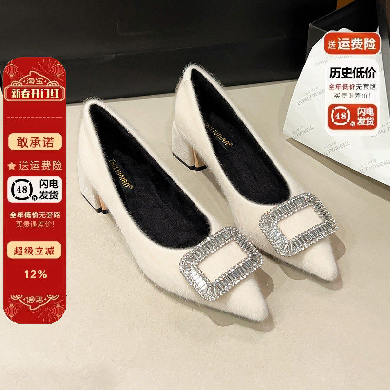 法式尖头加绒高跟鞋女2025新款冬季白色毛毛鞋中跟晚晚鞋粗跟单鞋