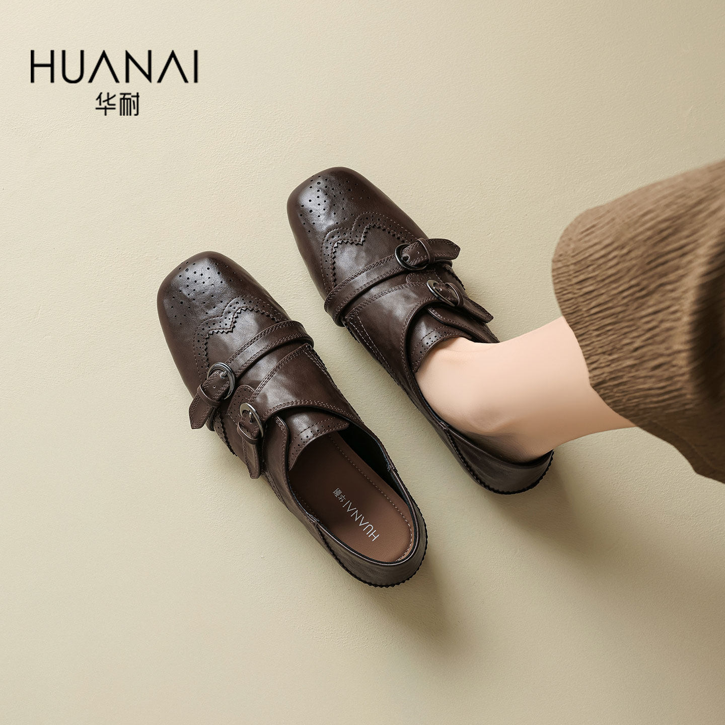 华耐英伦风乐福鞋女款2026春季爆款一脚蹬布洛克女鞋两穿平底单鞋