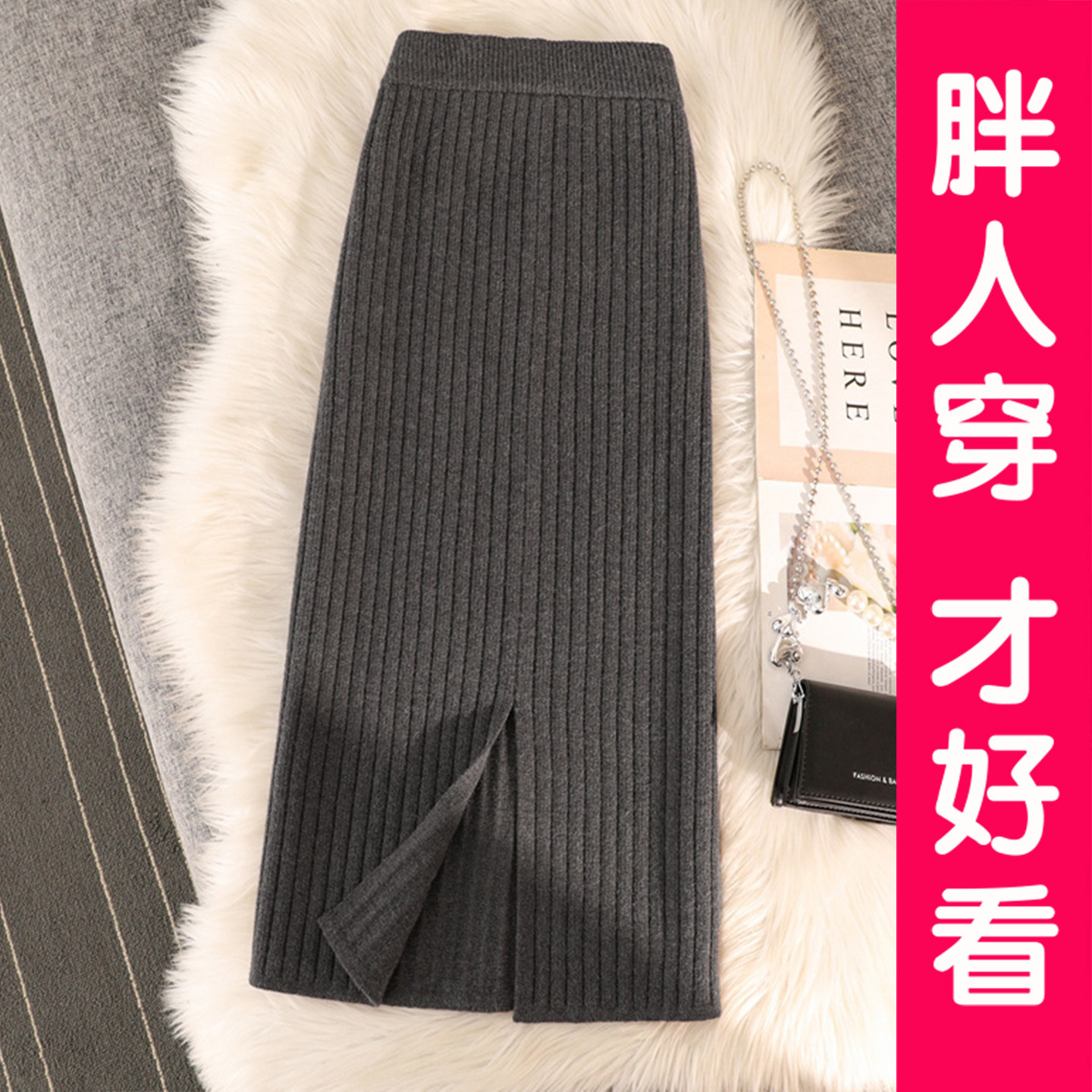 大码针织半身裙秋冬女包臀开叉一步裙高腰宽松加厚超长直筒裙胖mm