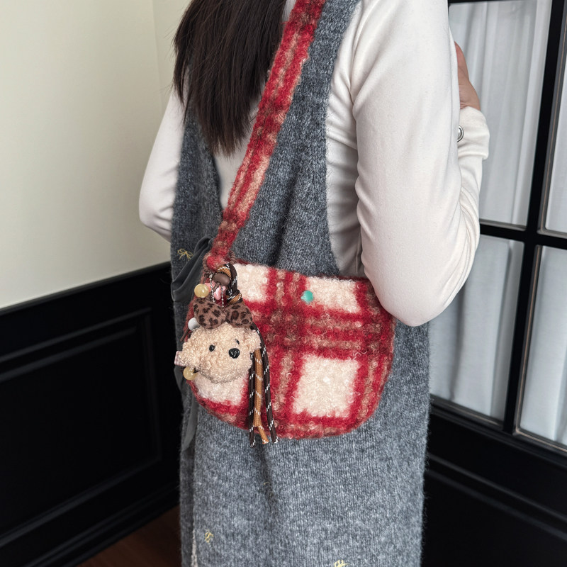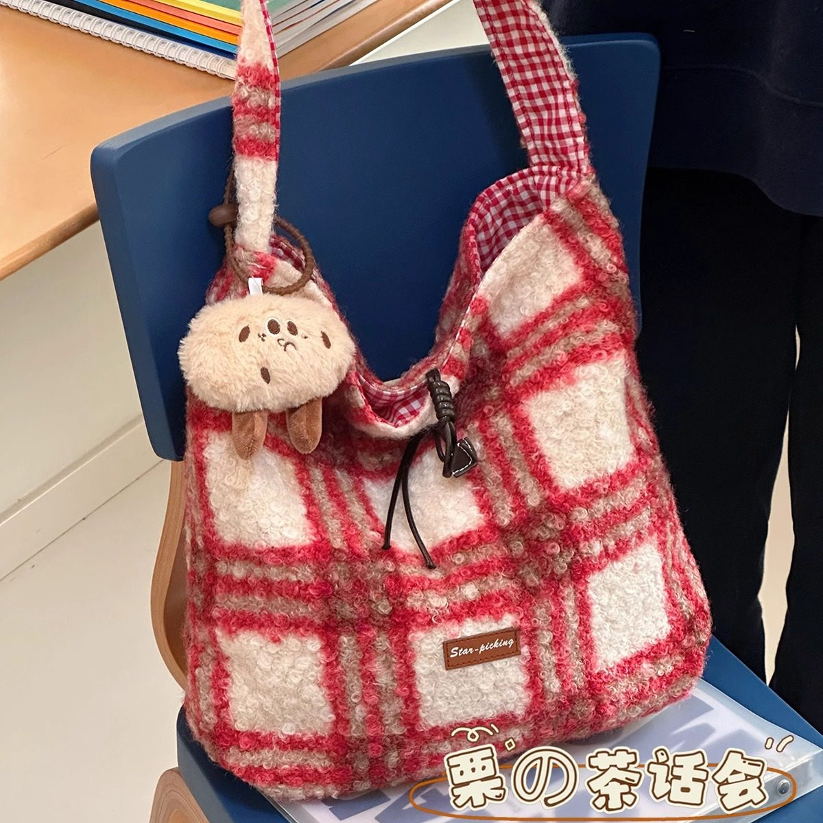秋冬复古格子红色斜挎包毛绒可爱大容量学生上课通勤单肩包包女生
