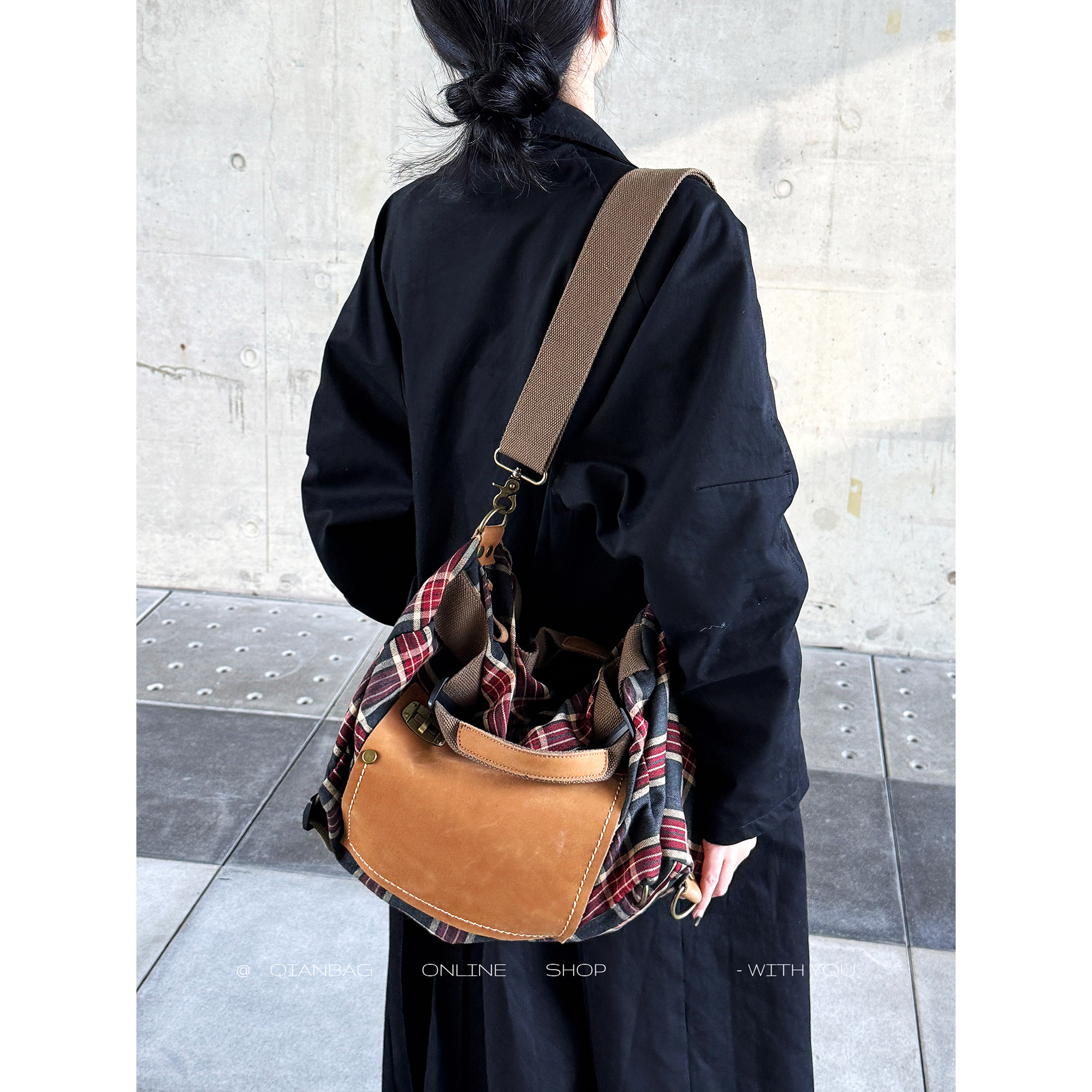 仟佰格双肩包女上班通勤背包大容量复古格子帆布包小众红色斜挎包
