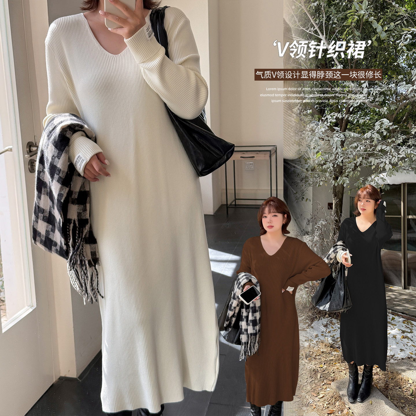 胖妹妹加大号码女装法式V领针织连衣裙2025冬简约气质温柔打底裙