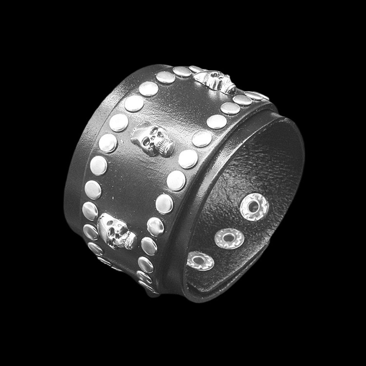 新创意合金银色骷髅头复古黑色纹理牛皮手链男女朋克饰品手镯手环