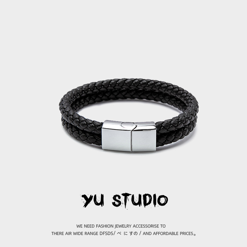 YUSTUDIO简约个性磁吸扣黑色双层真皮手链男女情侣款复古编织手绳