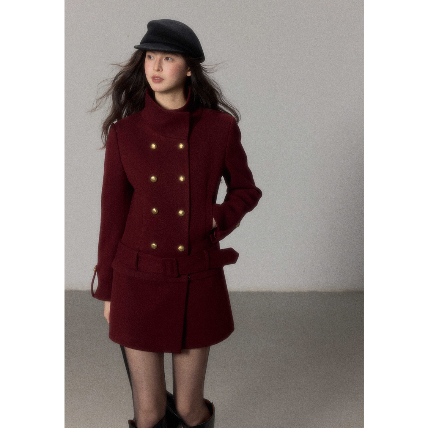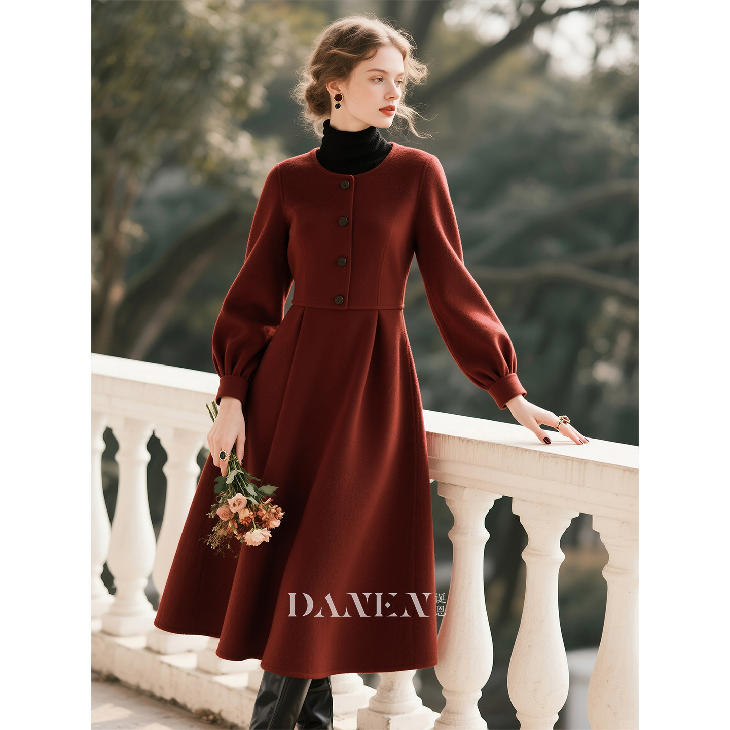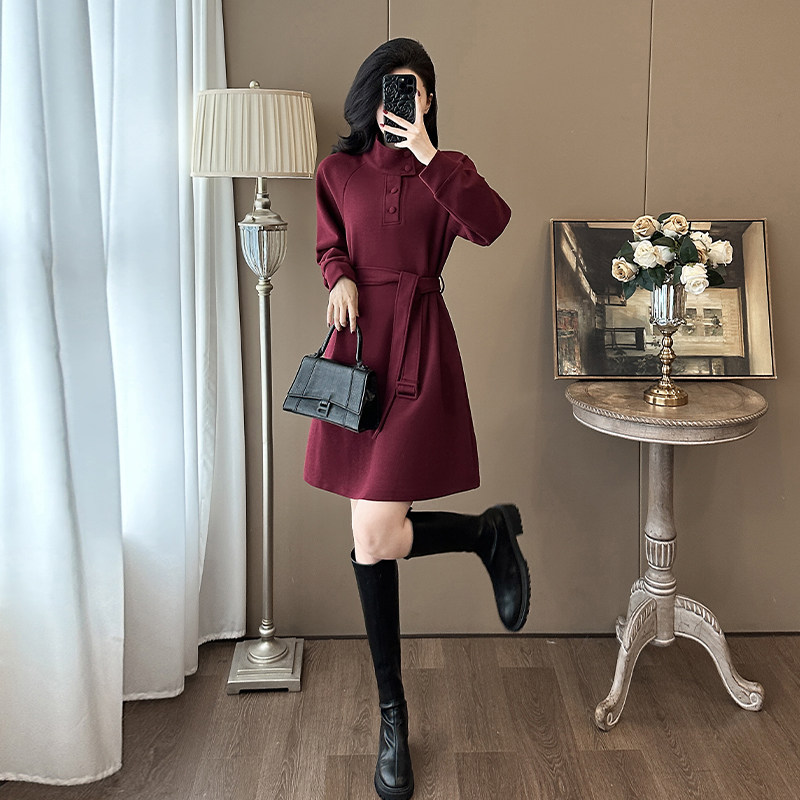 酒红色高领毛呢料连衣裙秋冬季高级感复古气质收腰显瘦超好看裙子