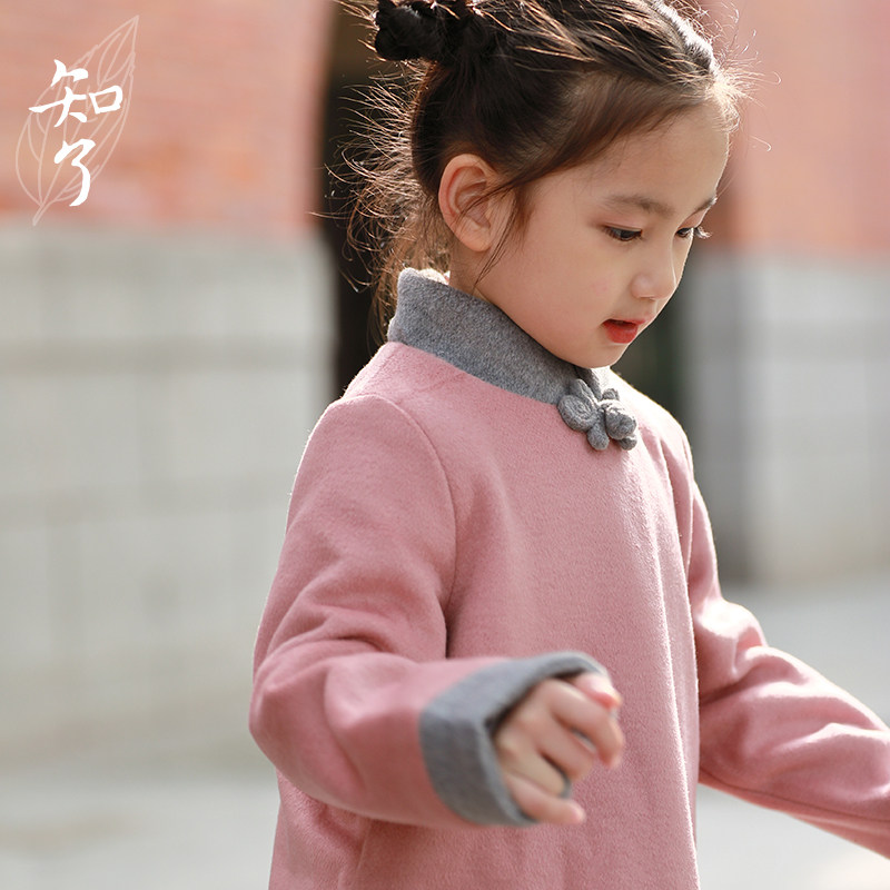 知了童装 文艺中式复古毛呢连衣裙女童夹棉呢子旗袍冬装 K2342