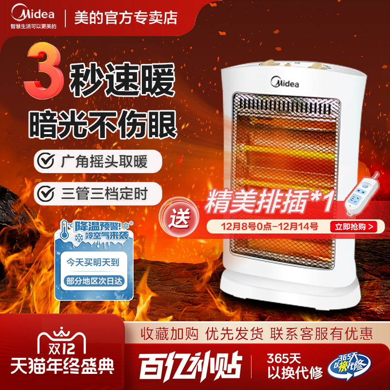 美的小太阳取暖器台式家用三管摇头节能速热省电办公室迷你暖风机