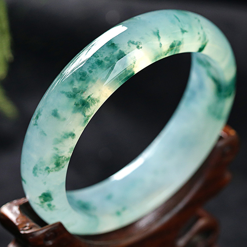 老坑冰种飘墨绿花玉石手镯玻璃种水润透翡翠色玉镯子女款贵妃玉镯
