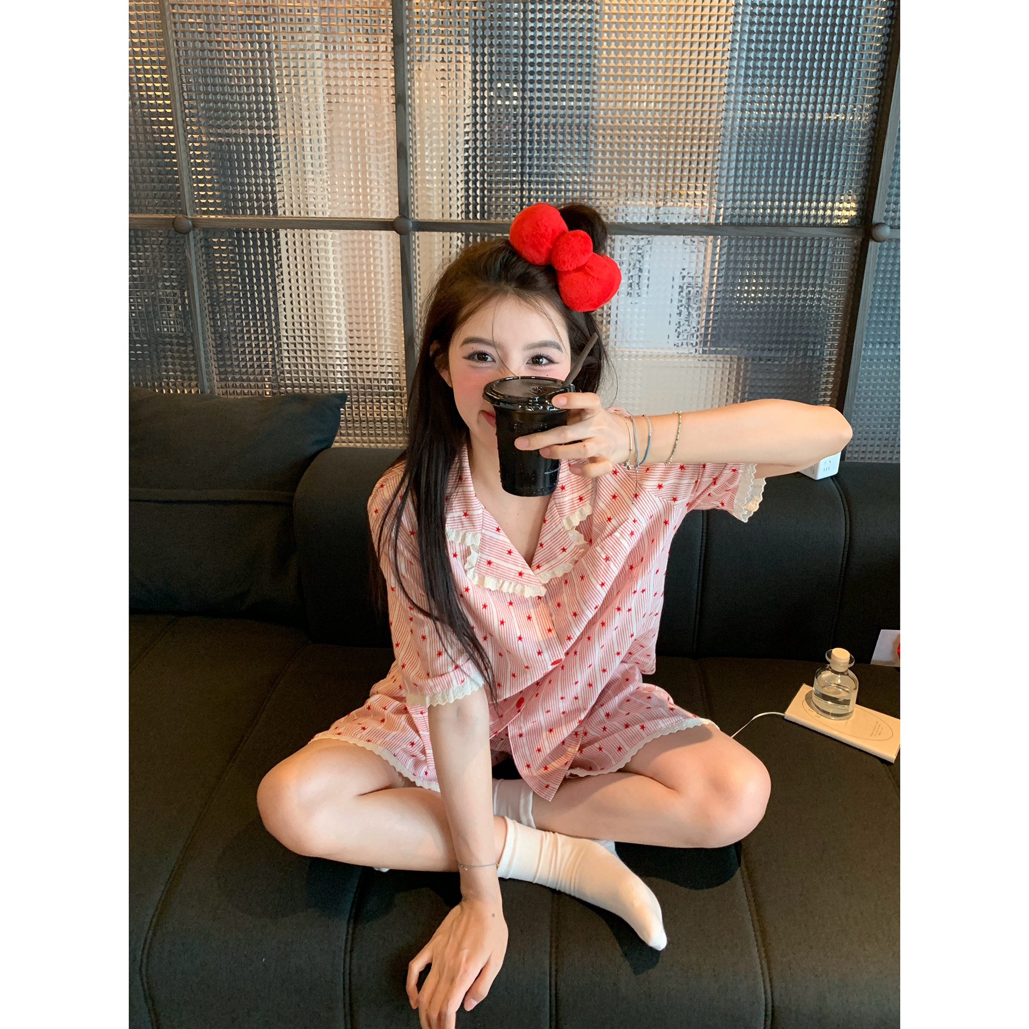 馨帮帮 翻领短袖睡衣甜美可爱星星条纹蕾丝边短裤家居服套装女夏