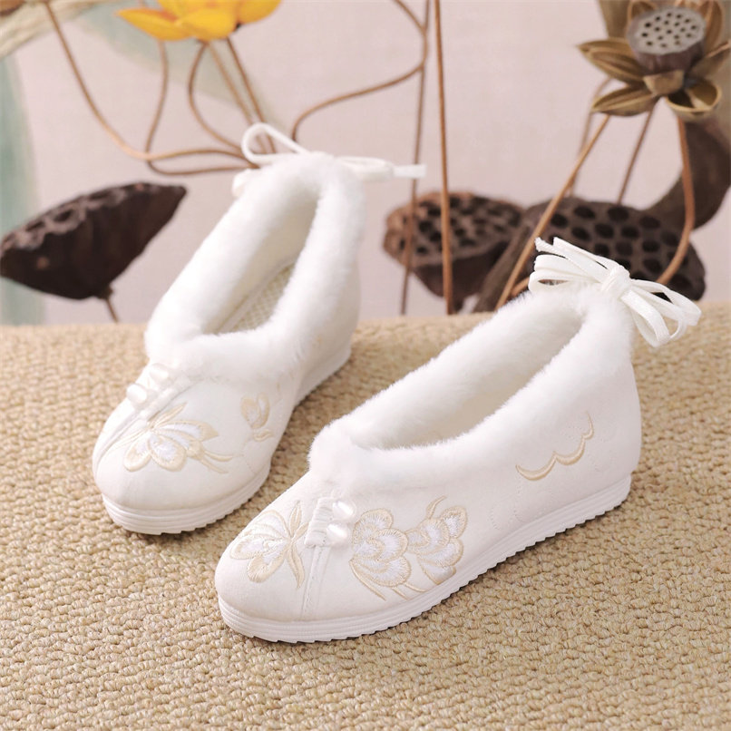冬季汉服女古风加绒棉鞋内增高坡跟淡雅绣花鞋民族风古装绣花女鞋