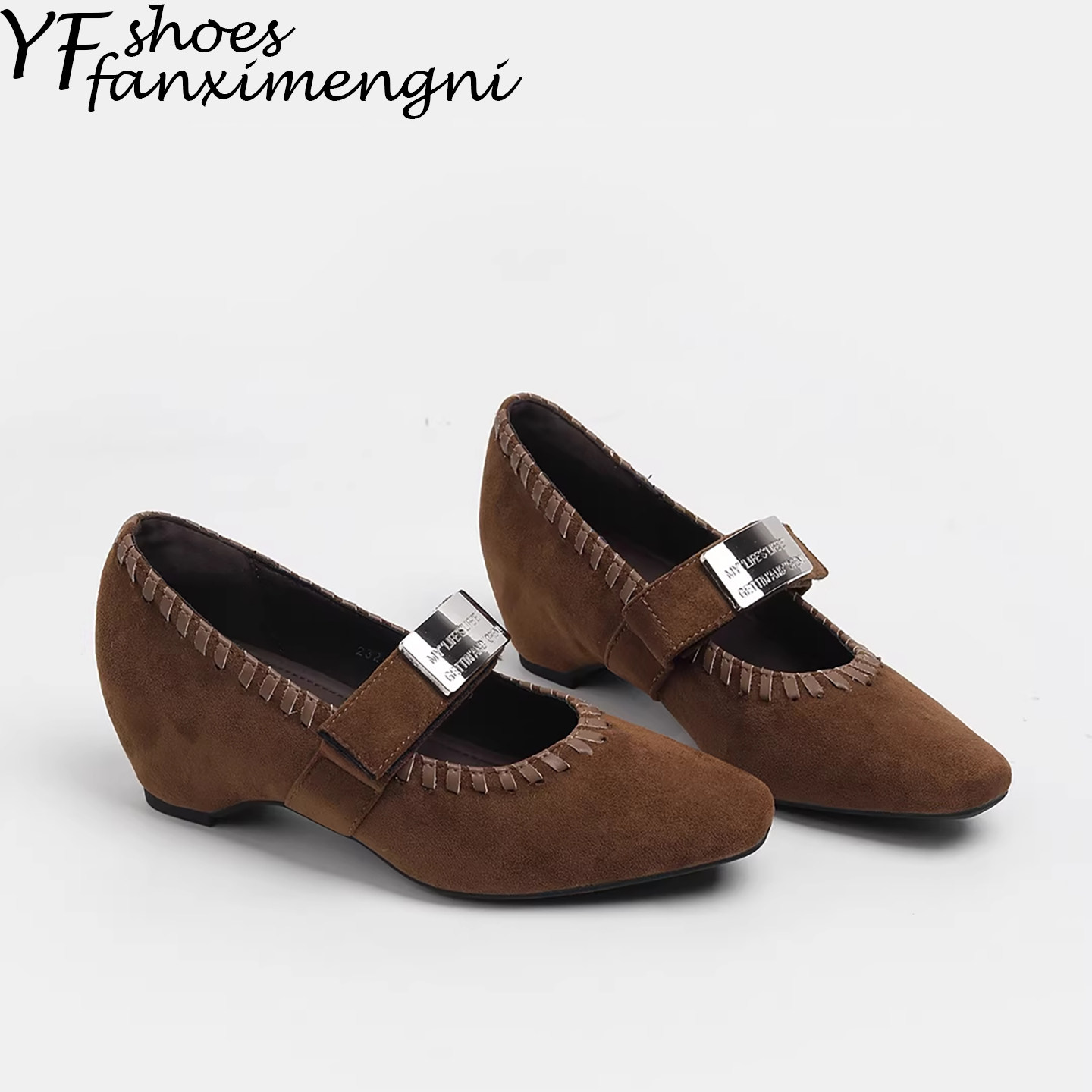复古反绒皮法式玛丽珍鞋女2026新款春季内增高坡跟棕色浅口单鞋女