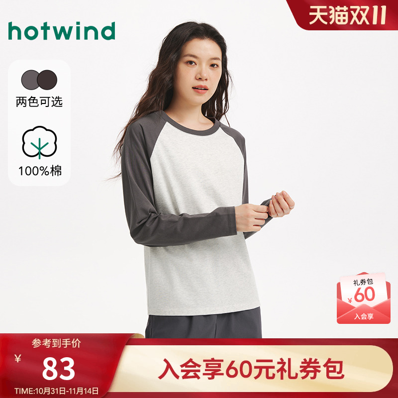 热风女士长袖T恤上衣2025年秋季新款基本插肩长袖宽松上衣打底衫