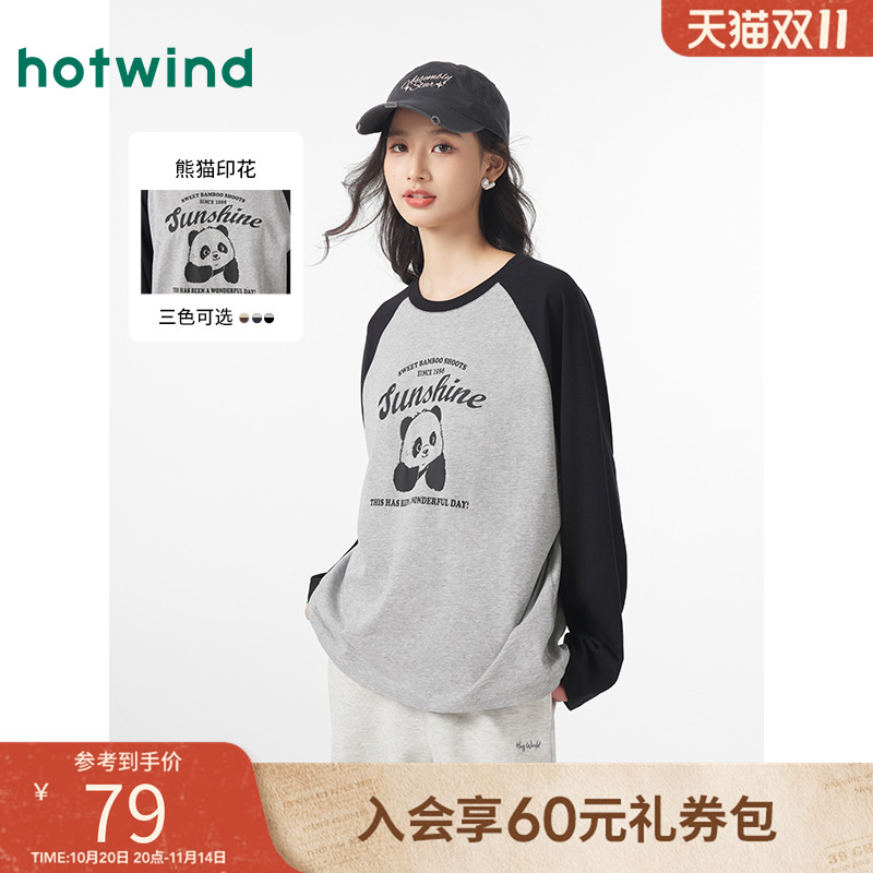 热风女士长袖T恤上衣2025年秋季新款宽松插肩长袖T学院风减龄T恤