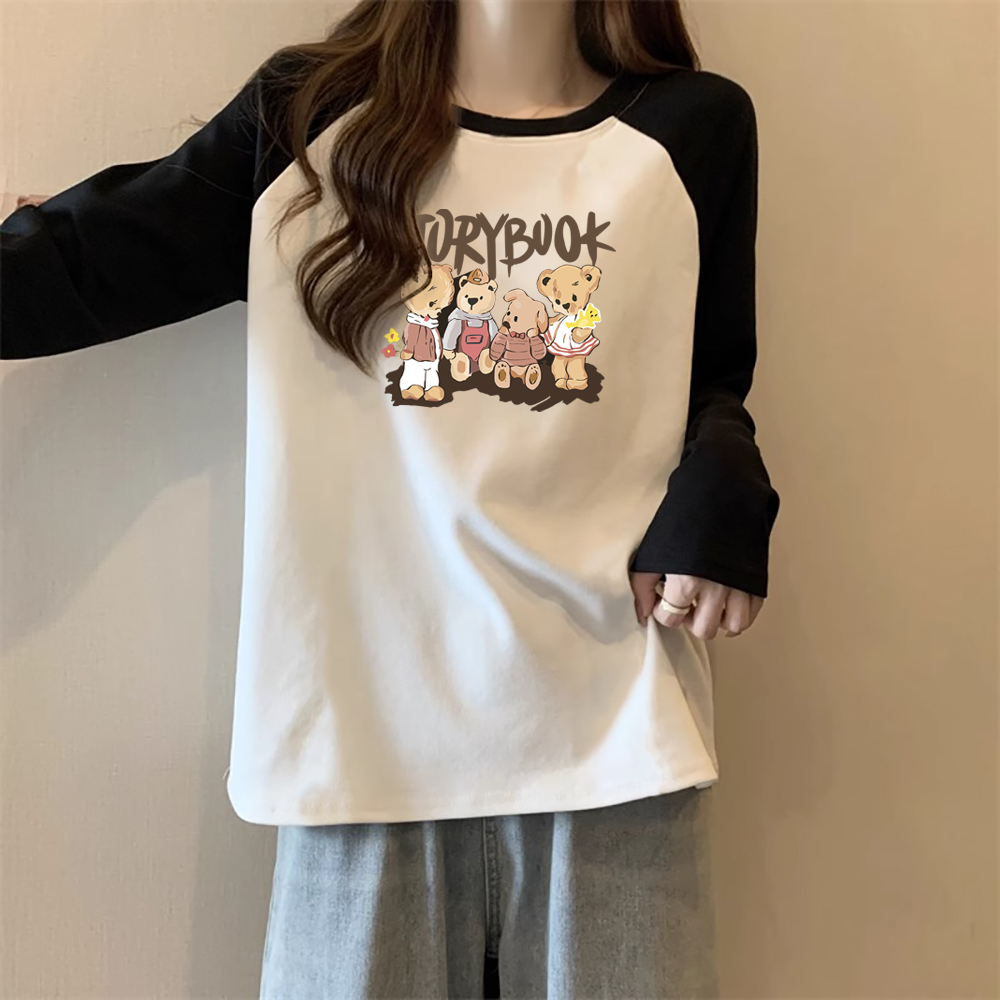 打底衫撞色插肩袖卡通小熊印花长袖上衣女装大码显瘦宽松百搭卫衣