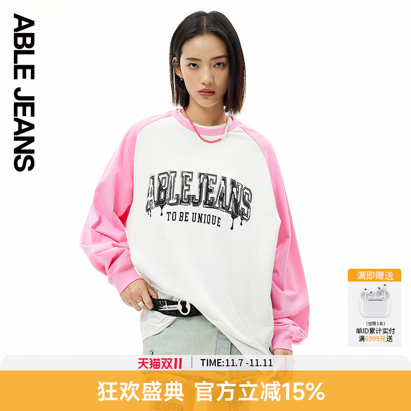 ABLE JEANS新款女士拼接插肩袖字母宽松美式长袖T恤薄款