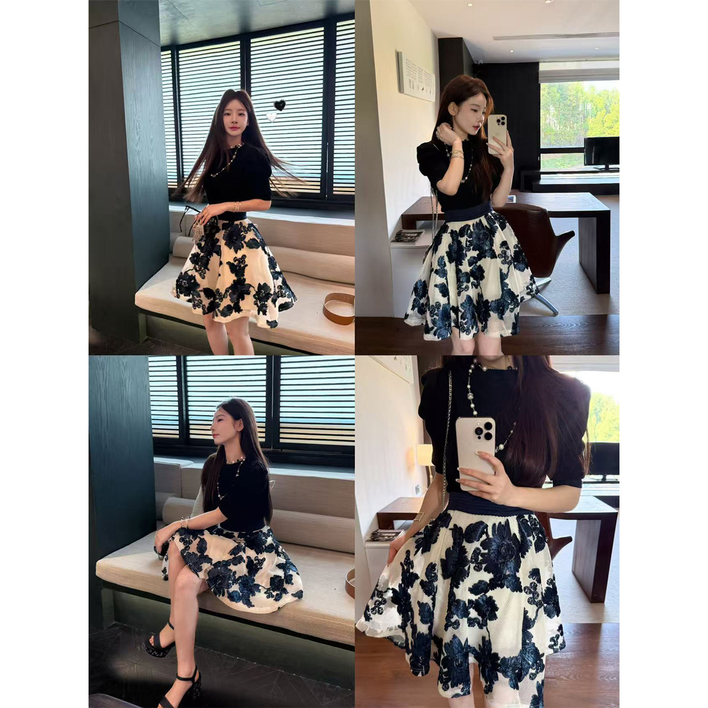 黑色碎花蛋糕短裙女高腰大码夏季胖mm遮肚显瘦梨形身材a字半身裙