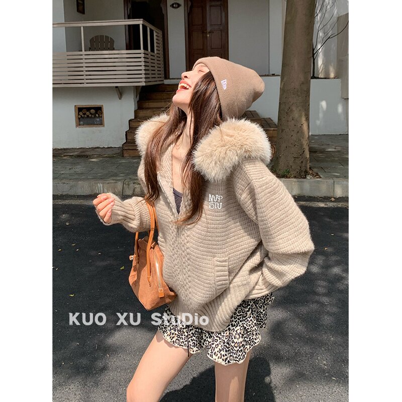 巨好看的初冬外套美式毛领针织衫连帽上衣加厚慵懒风高级感开衫女