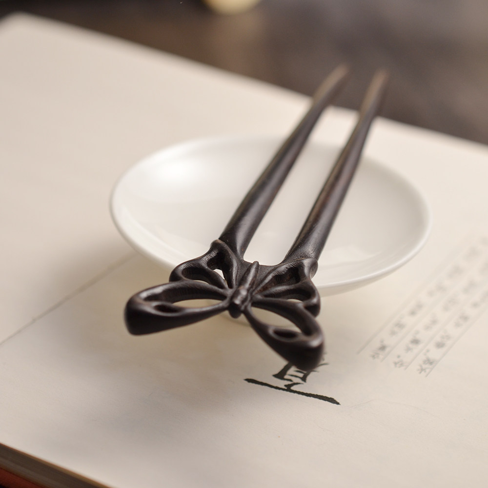 檀木发簪盘发复古典发饰头饰簪子古风古典双面镂空蝴蝶双股钗发钗