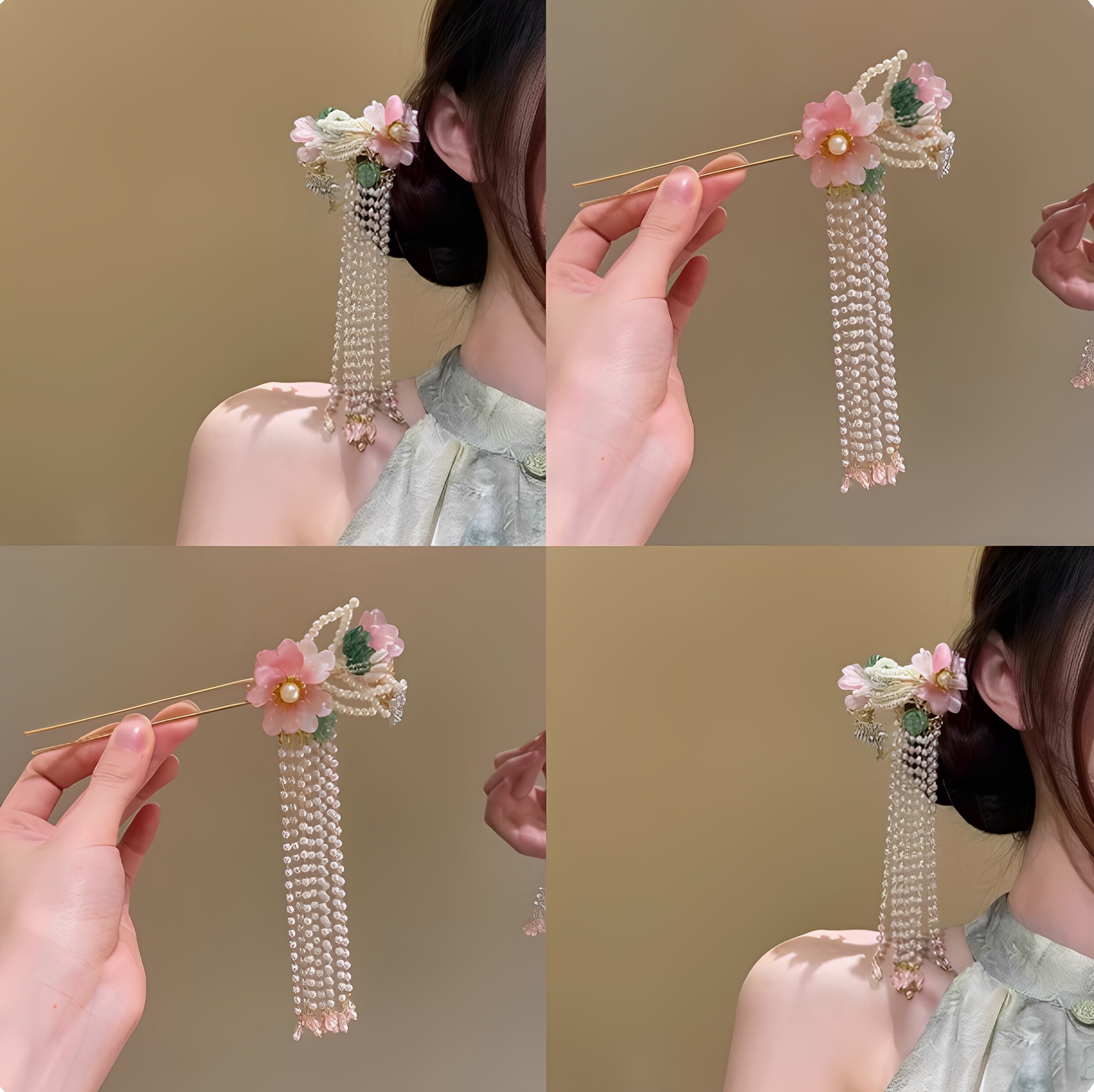 高级感古典国风珍珠花朵流苏发簪新中式发钗簪子新款盘发头饰品女