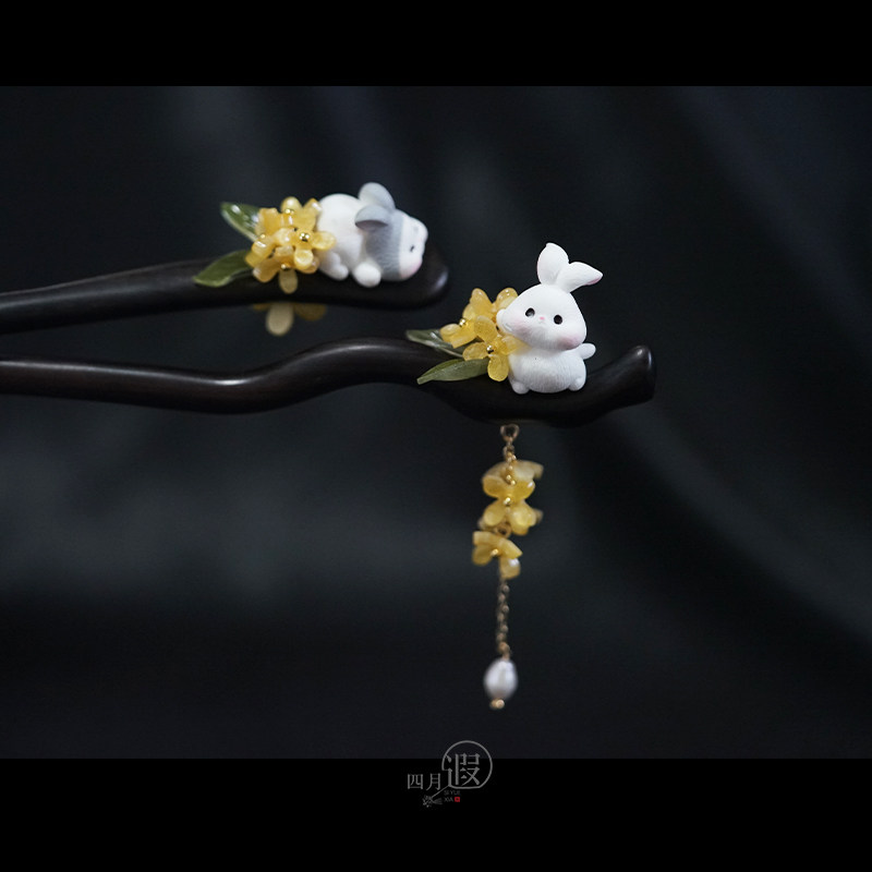 四月遐原创立体兔子桂花复古黑檀木簪子可爱气质礼物古典盘发汉服