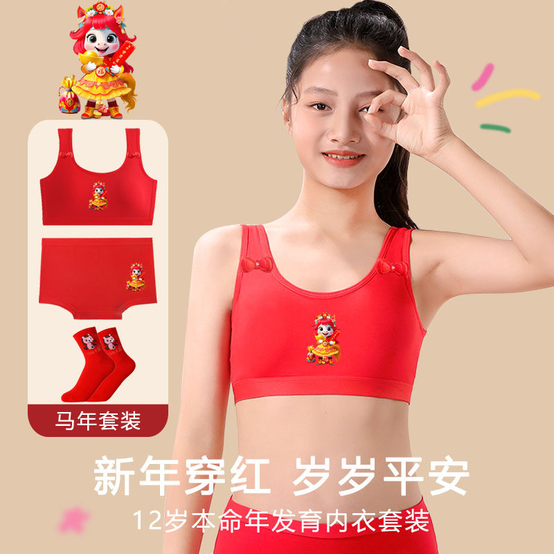 女童本命马年文胸新年红色内衣内裤套装12岁11学生发育期纯棉背心