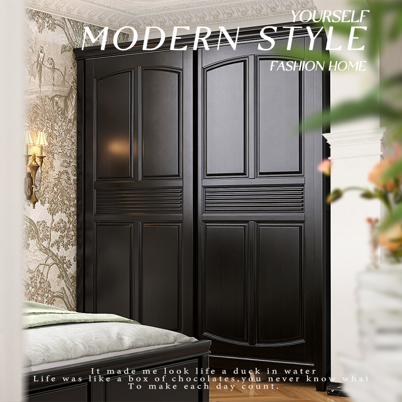 5V美式实木衣柜黑色现代简约推拉门衣柜复古法式储物衣橱卧室小户