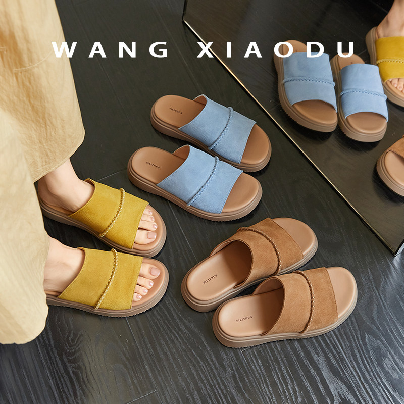 【王小毒】晴空画布○牛反绒一字拖女2025夏季多巴胺厚底沙滩拖鞋