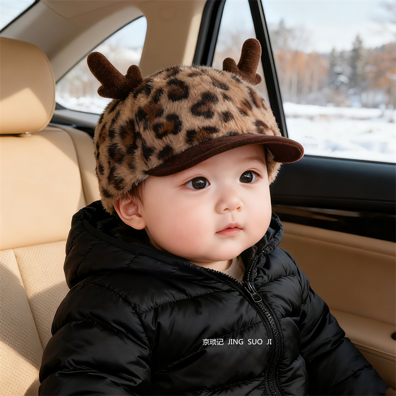 宝宝帽子秋冬季毛绒帽洋气豹纹鹿角男童防风棒球帽女童保暖鸭舌帽