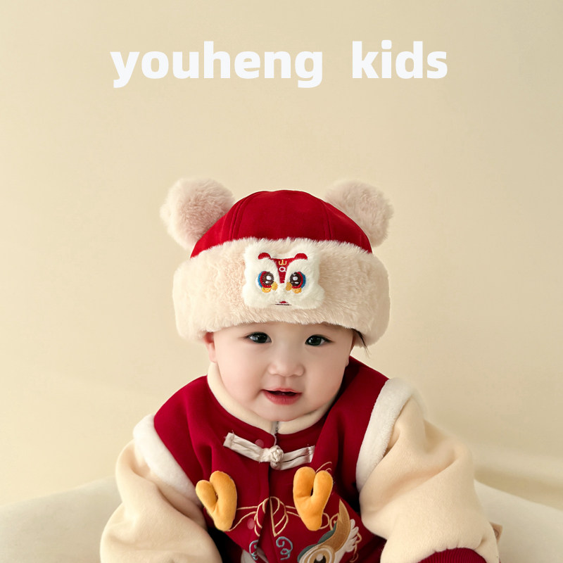 宝宝帽子秋冬季加厚红色圣诞新年可爱儿童地主帽保暖中国风醒狮帽