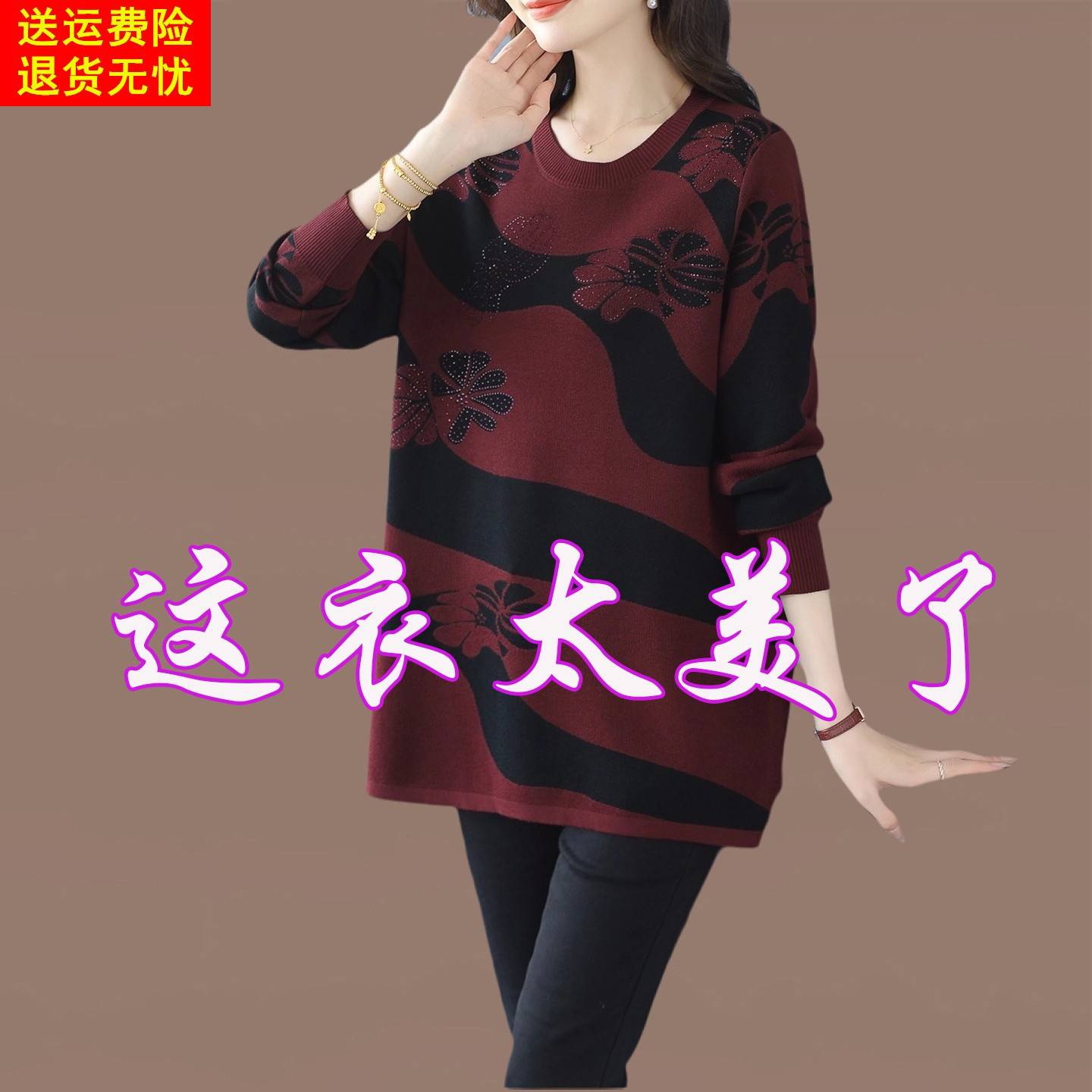 中老年妈妈装镶钻毛衣女中长款打底衫秋冬装宽松大码羊毛衫A字裙