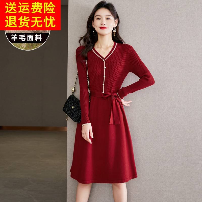 连衣裙女小香风羊毛针织打底裙秋冬系带v领a字裙高端中长款毛衣裙