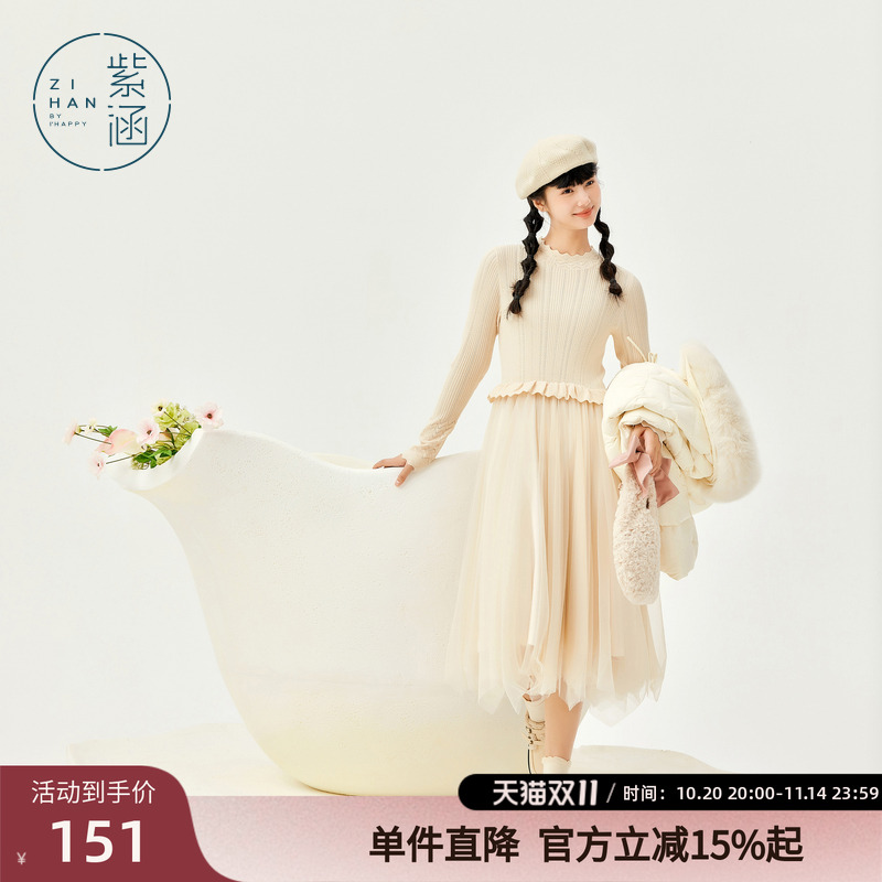 紫涵针织毛衣拼接网纱连衣裙女冬季新款甜美收腰小个子A字中长裙