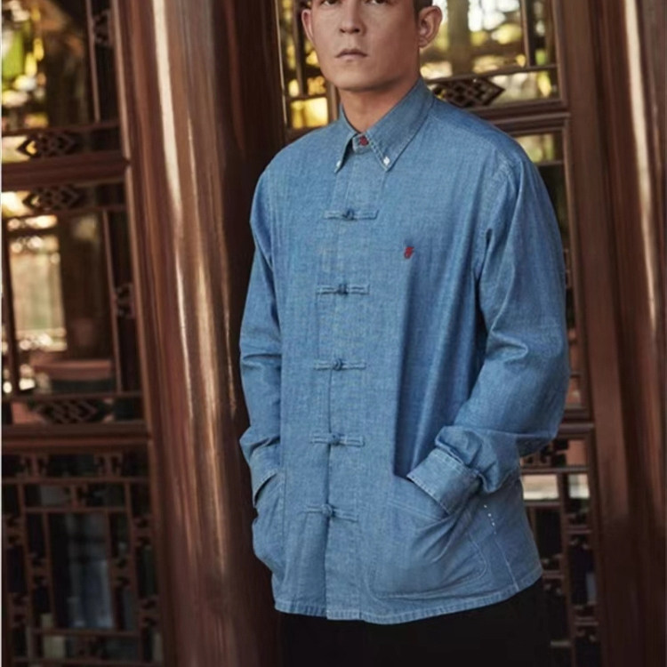 陈冠希同款CL风格小众潮牌秋冬款复古纯棉唐装盘扣牛仔衬衫外套男
