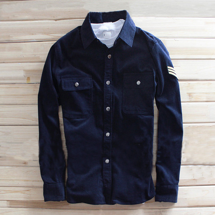 秋冬新款陈冠希同款潮牌徽章纯色保暖灯芯绒长袖衬衫男士纯棉衬衣